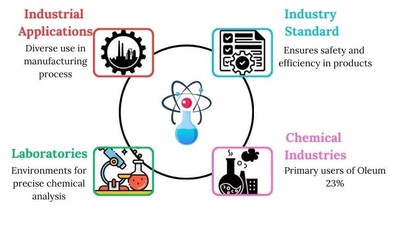 Oleum is crucial in modern industry, especially in the production of sulfuric acid—one of the most widely used chemicals globally. As a concentrated solution of sulfur trioxide in sulfuric acid, oleum enables precise control over acid strength by allowing titration of free $\mathrm{SO}_3$ content, or effectively supplying “over‑100%” sulfuric acid.