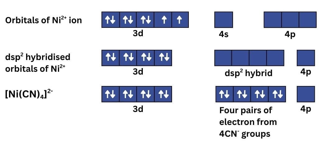 In the complex [Ni(CN)4]2-, nickel is in +2 oxidation state and has the electronic configuration 3d 8. A cyanide ion delivers a pair of electrons to each of the hybridised orbitals. The ligand cyanide (CN–) is a strong field ligand. Therefore, it will cause pairing of electrons. The hybridisation scheme is as shown in below diagram: