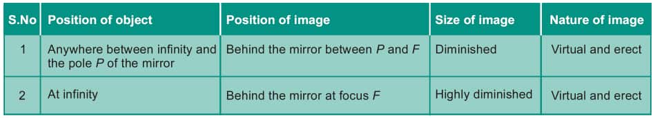 Convex mirror: Diverging mirror, always forms virtual, erect, and diminished images.
